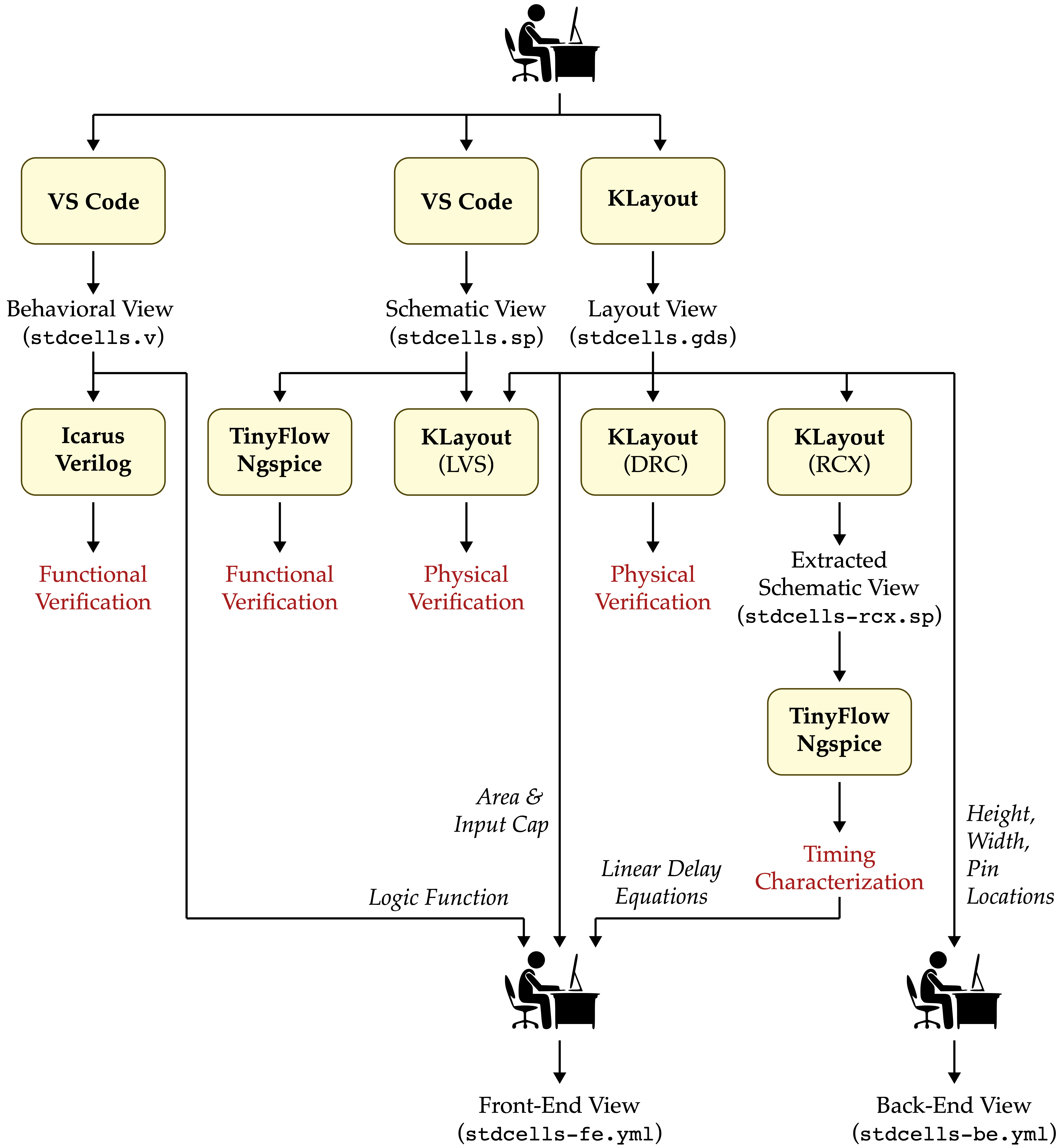 We will by begin by writing the behavioral view in Verilog and verifying its functionality using a Verilog test bench and Icarus Verilog. We will then write the schematic view in SPICE and verify its functionality using a SPICE test bench and TinyFlow-Ngspice. Instead of using Ngspice directly as in Lab 1, we will now be using our TinyFlow-Ngspice wrapper script which makes it much easier to run SPICE simulatoins. We will then use the KLayout design editor to create the layout, perform a design-rules check (DRC), perform a layout vs. schematic check (LVS), and generate an extracted schematic. We will re-simulate the extracted transistor-level schematic using TinyFlow-Ngspice to characterize the propagation delay for different load capacitances in order to create a linear delay model. Finally, we will write the front-end and back-end views for our standard-cell inverter in two YAML files. We will also implement three auxillary standard cells (i.e., TIEHI, TIELO, FILL).
