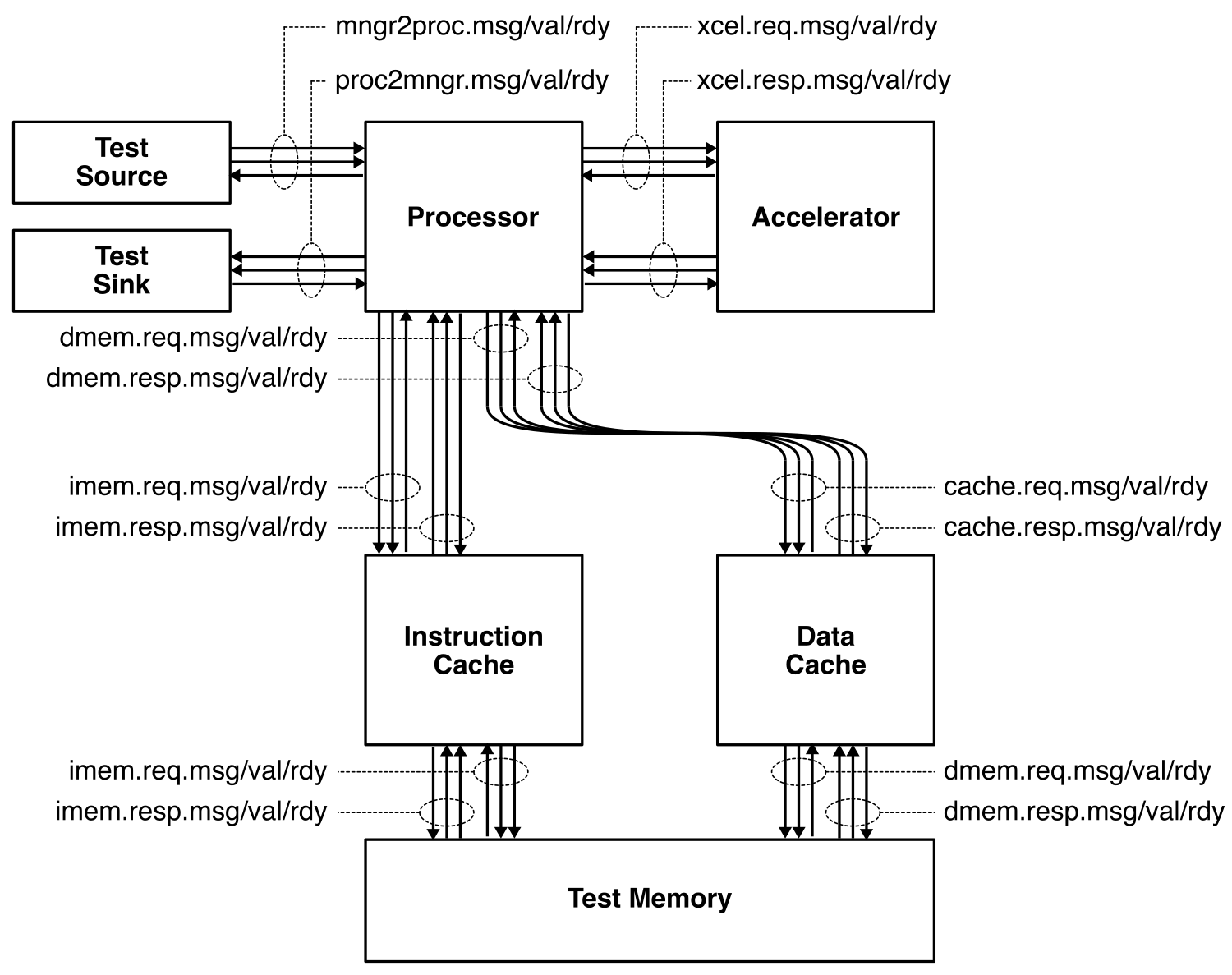 We are now ready to test and evaluate the complete system with the procesor, caches, and accelerator. We already developed the software to control the accelerator with the FL model. So all we need to do is run the test program and evaluation program on the accelerator RTL implementation.